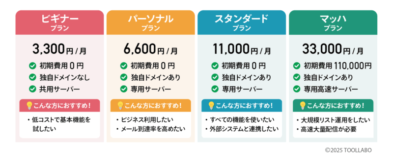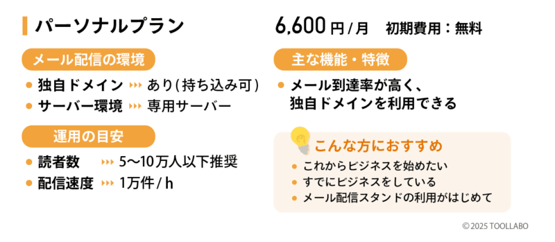パーソナルプランは、本格的にビジネスを始めたい方や、メールの到達率を重視したい方に適しています。