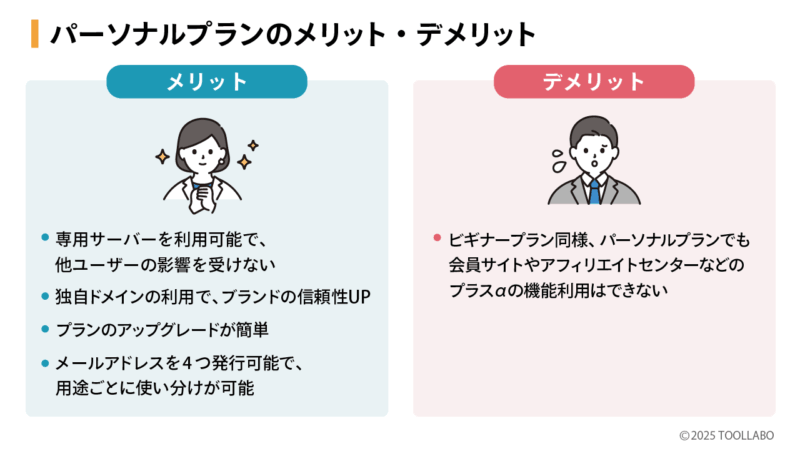 パーソナルプランでは、ビギナープランの全機能に加え、独自ドメインの使用や専用サーバーの利用が可能です。