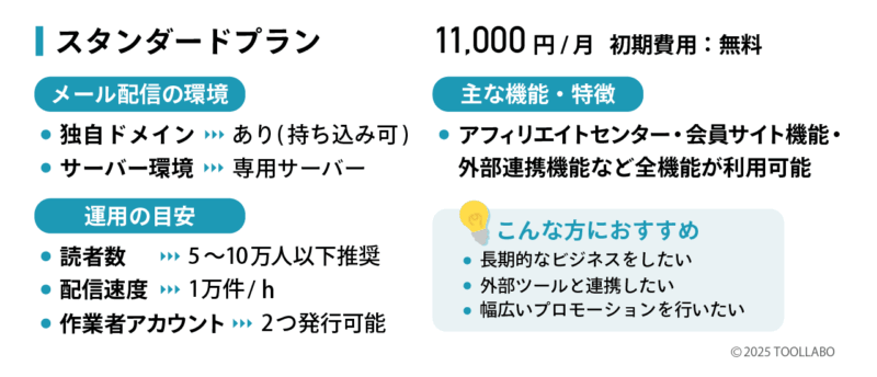 | パーソナルプラン | 6,600円 | 専用サーバー | 独自ドメイン、 到達率向上 |