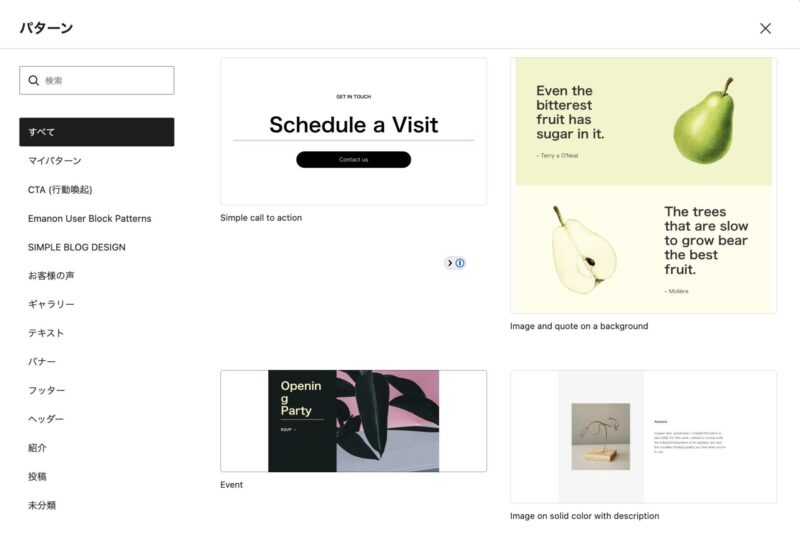 WordPressには最初からいくつかのブロックパターンが用意されていますが、自分で作ることもできますし、プラグインで追加することも可能です。