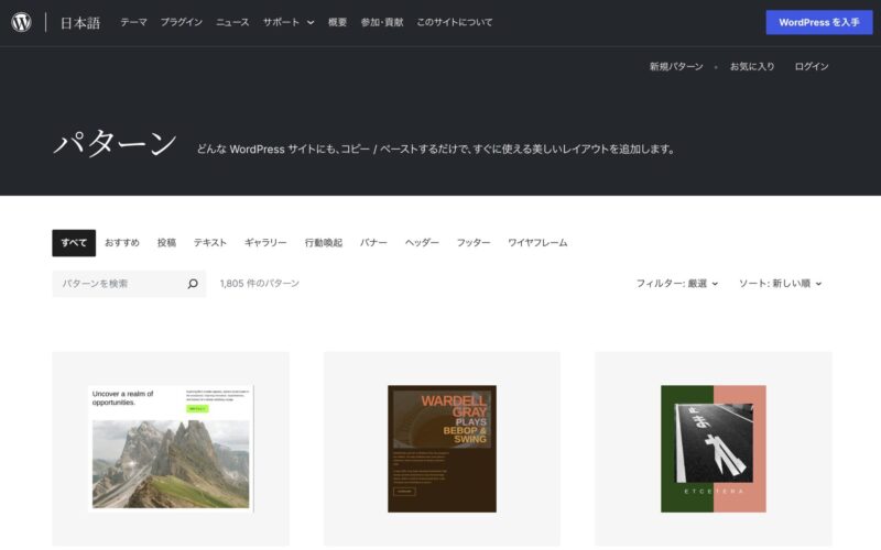 また、WordPressにはパターンをまとめて公開しているパターンライブラリもあり、さまざまなブロックパターンを参考にすることもできます。