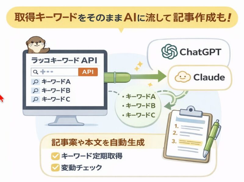 APIで取得したキーワードをそのままChatGPTやClaudeに流して、記事の構成案や本文の生成に活かすことも可能です。