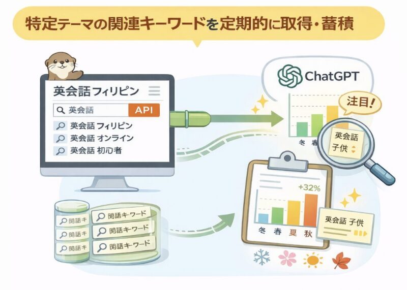特定テーマの関連キーワードを定期的に取得・蓄積することで、