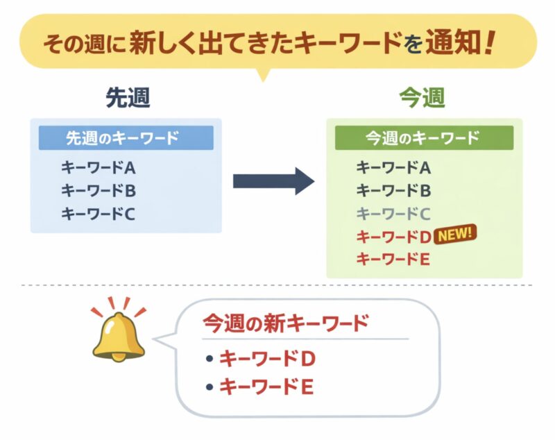 たとえば「週1回、自動で関連キーワードを取得して、その週に新しく出てきたキーワードだけを通知してくれる」という仕組みが作れます。