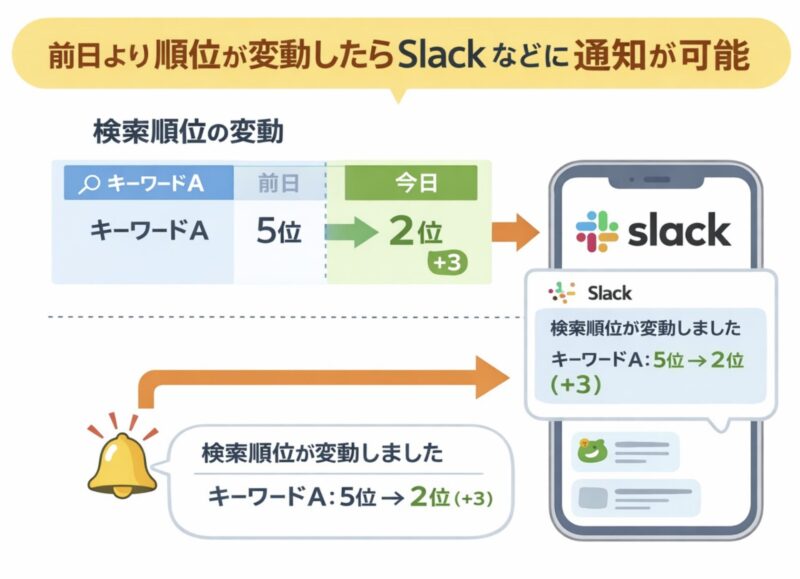 毎日自動で検索順位を取得・保存して、前日より順位が変動したらSlackなどに通知することも可能になります。