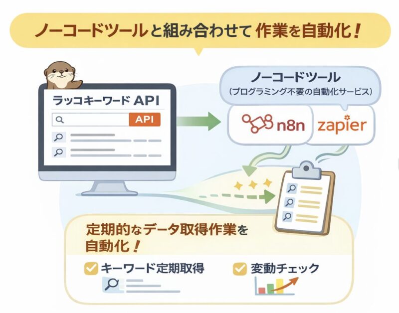 「n8n」や「Zapier」といったノーコードツール(プログラミング不要で自動化できるサービス)と組み合わせることで、定期的なデータ取得作業を自動化できます。