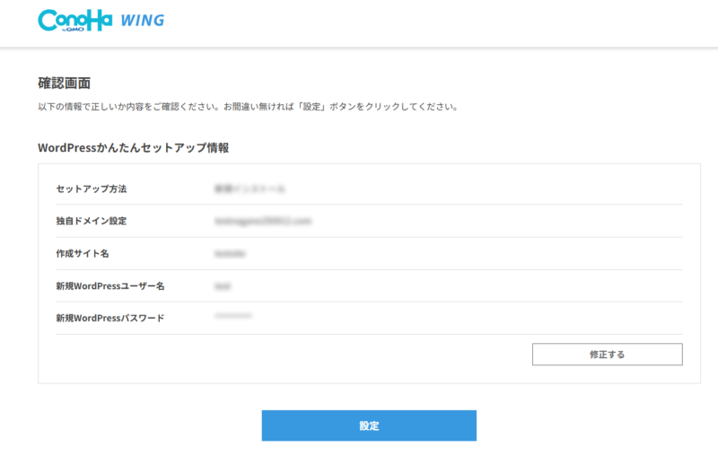 契約が完了すると、そのまま「WordPressかんたんセットアップ」の画面に進めます。