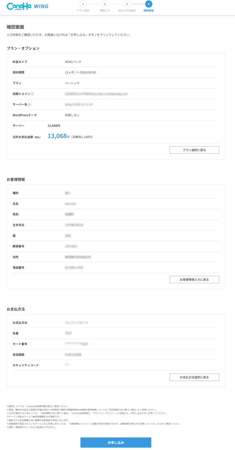 支払いが完了すると確認画面が表示され「お申し込み」をクリックして契約完了です。