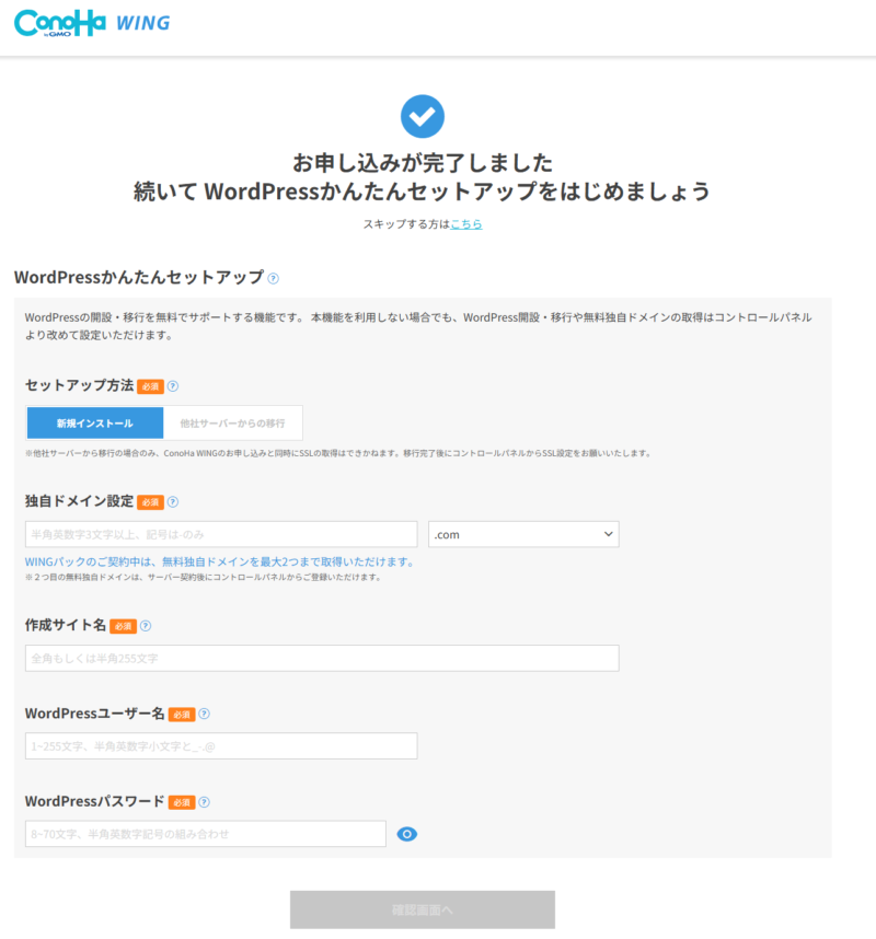 申込後に「WordPressかんたんセットアップ」をスキップしてしまうと、この機能を利用できなくなるため必ず実行しておきましょう。