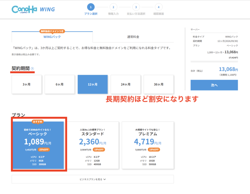 次に、プランや契約期間を選択します。