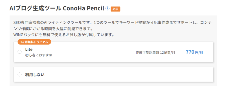 加えて、契約画面では WordPressテーマ や AIブログ生成ツール「ConoHa Pencil」 の選択も可能です。
