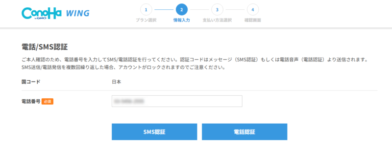 電話番号を入力してSMS認証または電話認証を選択して認証コードを発行します。