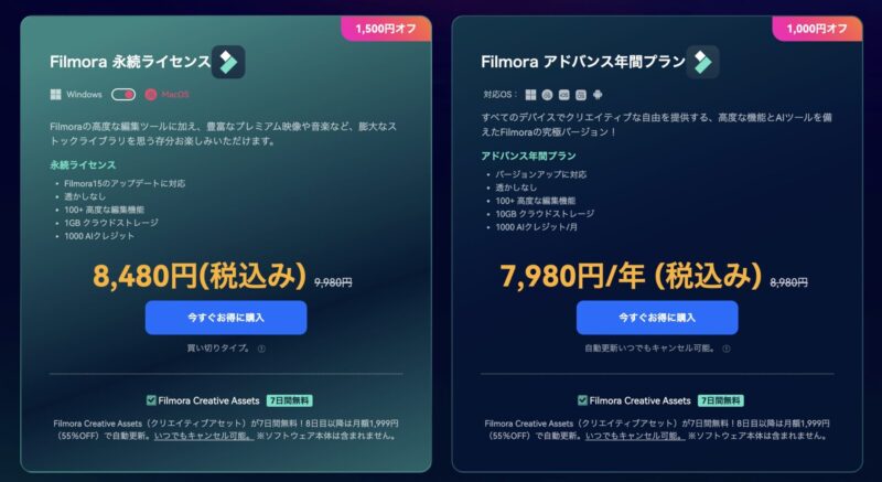 | 個人向け永続ライセンス | 最大 1,500円OFF | 透かしなし、高度な編集機能、クラウドストレージ、AIクレジット付 |
