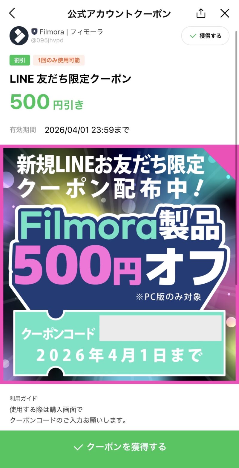 WondershareのLINE公式アカウントを友達追加することで、500円OFFの割引クーポンをゲットできます。