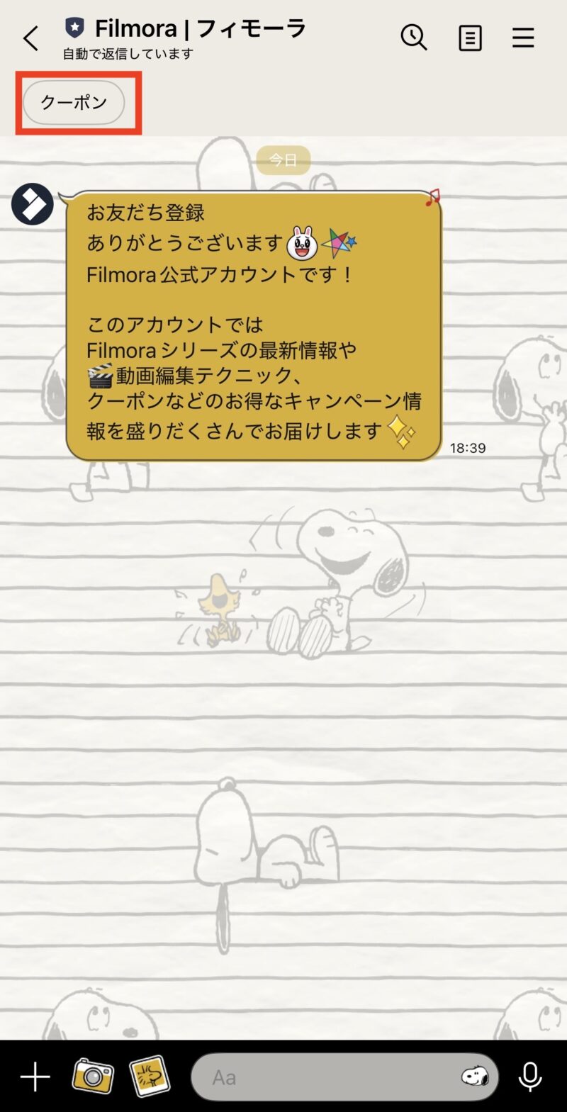 クーポンコードはトークで送られてくるのではなく、トーク画面の左上にある「クーポン」ボタンをタップすることで表示されます。