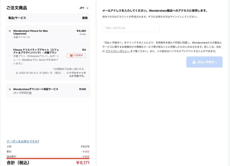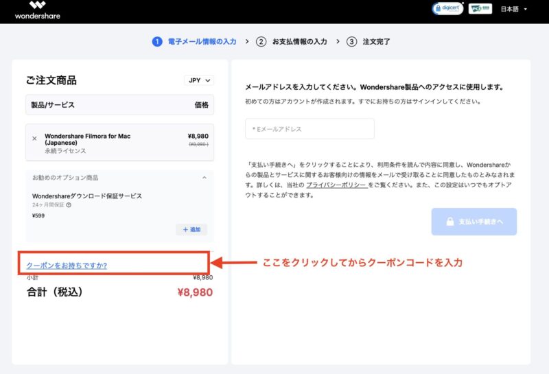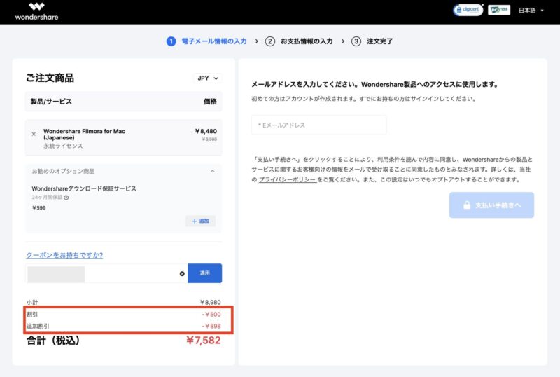 Filmoraの購入ページでは、特定の条件下でクーポンコード入力欄が表示されないことがあります。