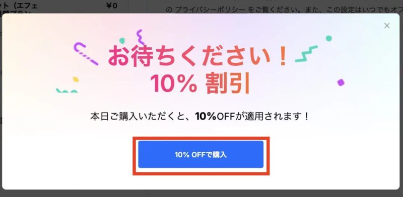 すると、画面に「10%OFFで購入」などの割引ポップアップが自動で表示されます。